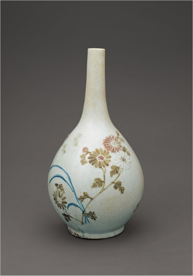 길고 곧게 뻗은 목 부분과 달항아리를 연상케 하는 풍만한 몸체에 더 해, 아취로운 문양 요소들이 조화롭게 표현된 이 병은 18세기 조선시대 왕 실용자기를 전문적으로 생산했던 경기도 광주 사옹원 분원에서 만들어 진 것으로 추정된다.